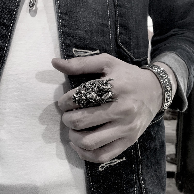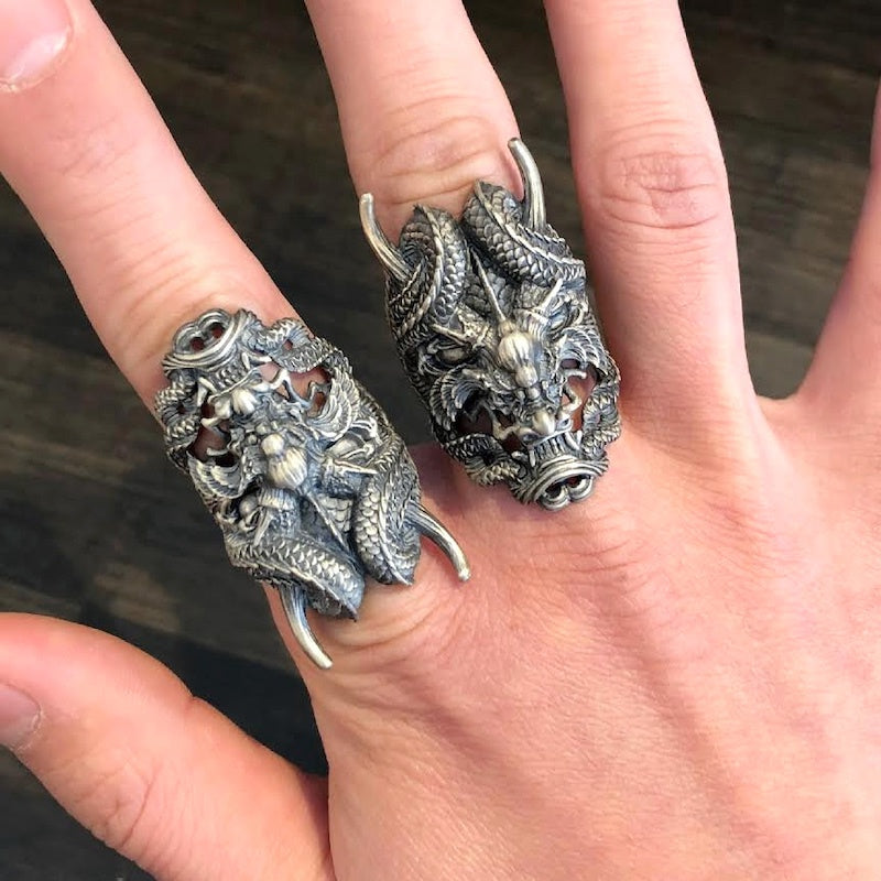 【Silver Monsters】日本雕畫雙絕 Dual Flow 細緻雕工 龍蟠般若 龍鬼 原創設計純銀戒指