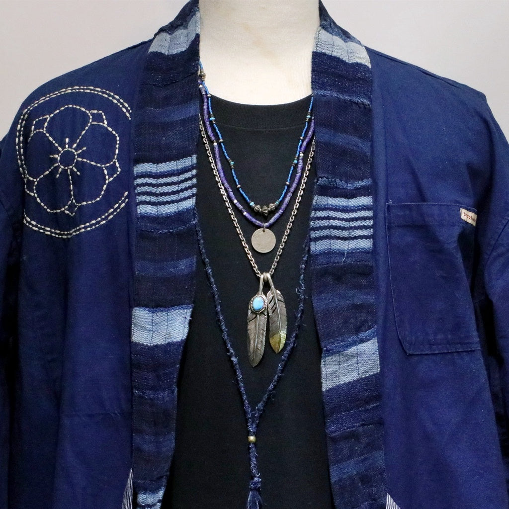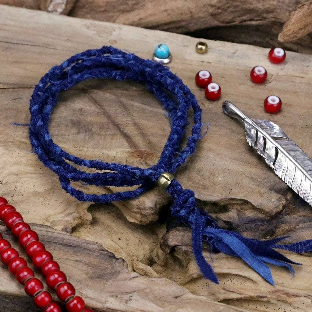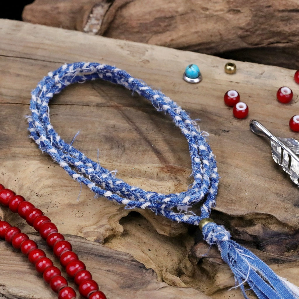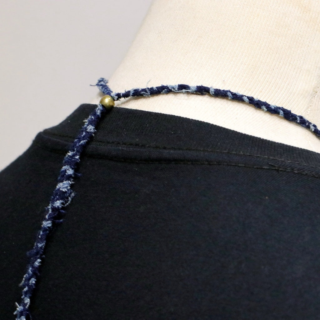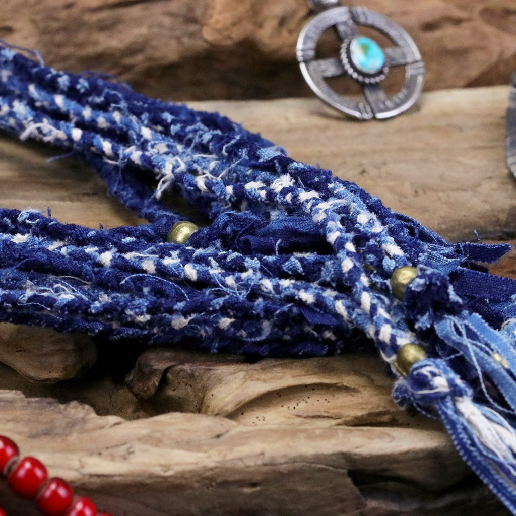 這組編織項鍊以真正的古董日本布裁成長條後手工圓編而成,未經收邊,呈現出Boro風格的自然不做作,配有黃銅調節環,可直接單一配戴、多層次配戴,或是把底下繩結打開,搭配手工銀飾也很合適。